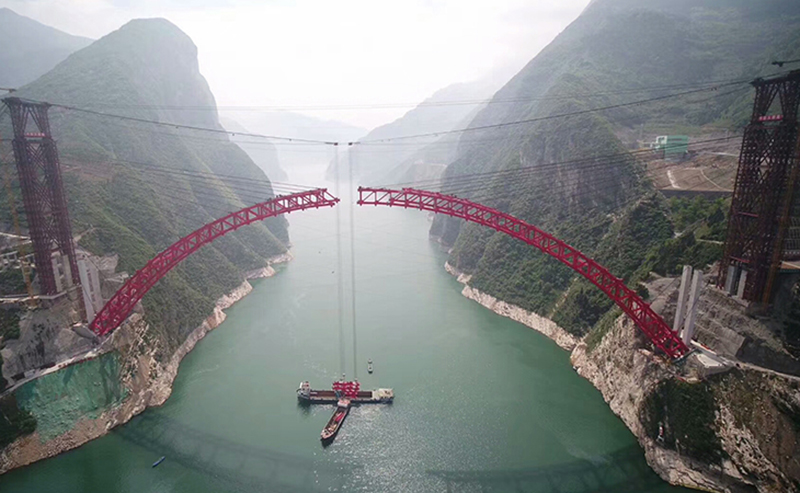 秭歸長江大橋為中承式鋼箱桁架拱橋,主跨531.2米,全長883.2米,采用2×200噸纜索起重機安裝,2018年5月22日主拱合龍。