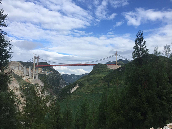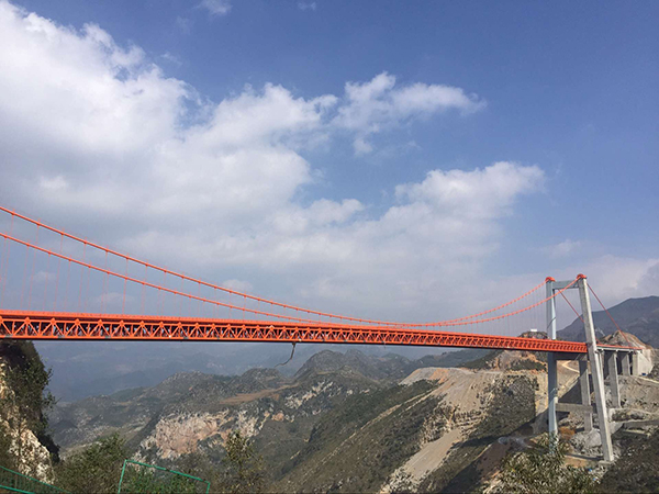 貴州畢都高速抵母河特大橋,橋長1220米,主橋538米,雙塔單跨鋼桁懸索橋,采用2×100噸纜索起重機(jī)配自動旋轉(zhuǎn)吊鉤安裝鋼桁梁,節(jié)段重量達(dá)150噸。